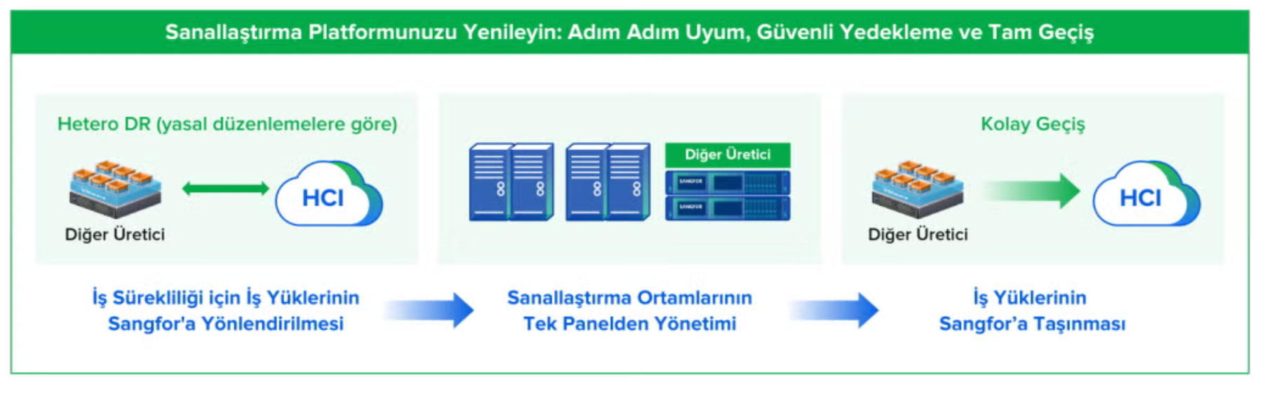 Sangfor, mevcut altyapı yatırımlarınızı koruyan, güven temelli ve yapılandırılmış bir geçiş yaklaşımıyla sanallaştırma dönüşümünüzü güvenle yönetir. Riskleri en aza indiren bu strateji, geçiş sürecinin her aşamasında kurumsal sürekliliğinizi desteklemeyi hedefler.